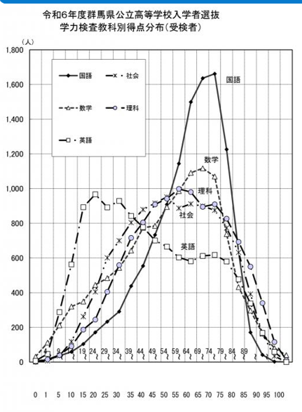 実際に群馬県の高校入試の英語の点数分布を見ても、その差ははっきり表れています。(添付資料あり)